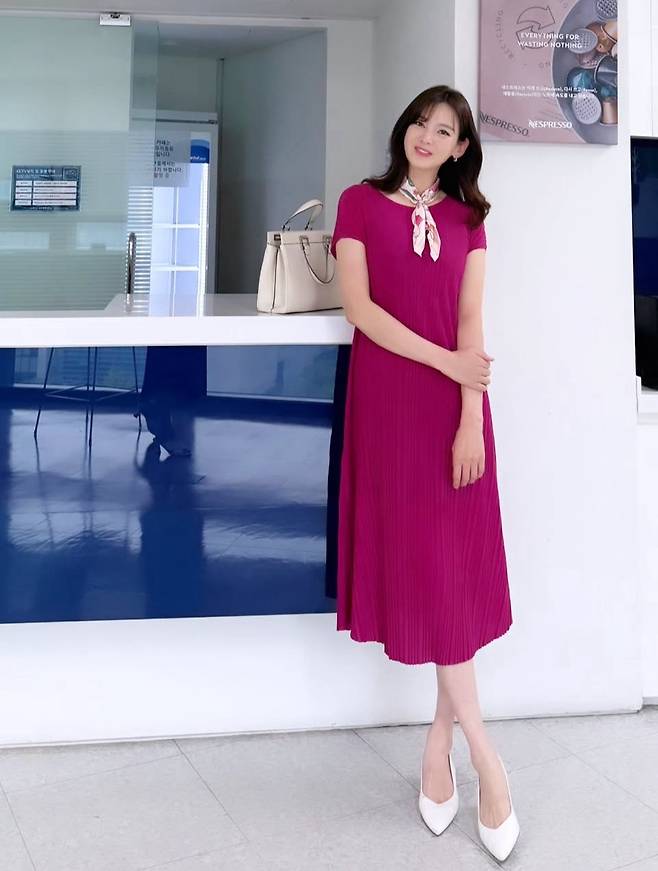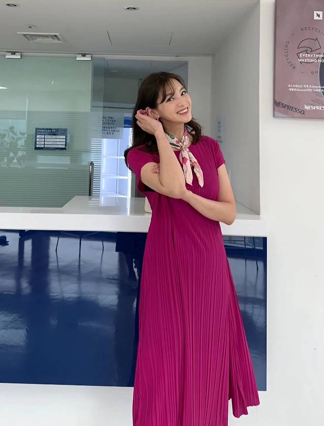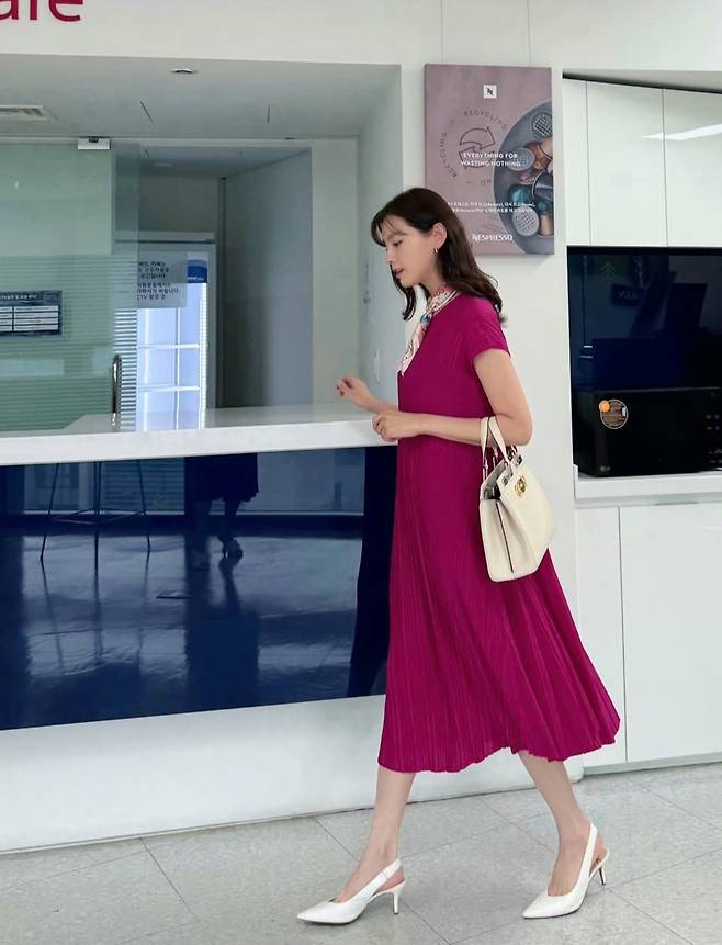 풍부한 색감의 퍼플 플리츠 원피스에 스카프를 매치해 클래식하면서도 화사한 포인트를 줬습니다.