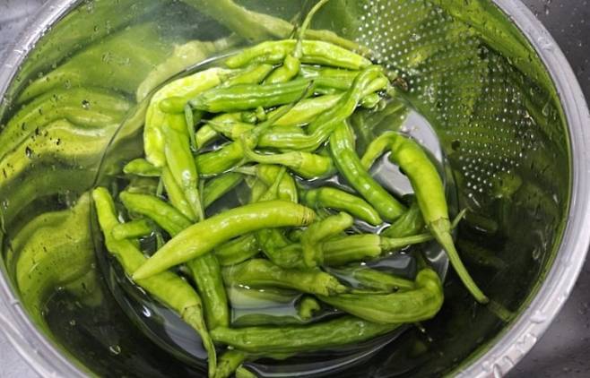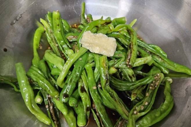 꽈리고추는 꼭지를 떼고 세로로 한 번 칼집을 내주세요. 이렇게 해야 조림 국물이 속까지 잘 배고, 터지지도 않아요.