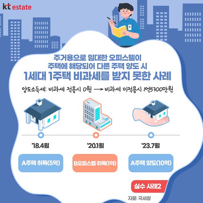 국세청에서는 최근 ‘양도소득세 실수톡톡’에서 1세대 1주택 비과세 요건을 충족하지 못한 사례를 공개했는데요. 1세대 1주택 비과세를 받기 위해서는 2년 이상 보유하여야 하며, 취득 당시 조정대상지역 내 주택은 2년 이상 실거주해야 합니다. 단, 비조정대상지역은 2년 실거주 요건이 적용되지 않습니다.