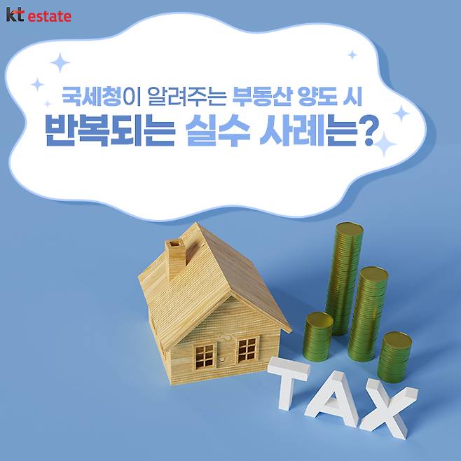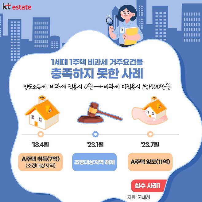국세청에서는 최근 ‘양도소득세 실수톡톡’에서 1세대 1주택 비과세 요건을 충족하지 못한 사례를 공개했는데요. 1세대 1주택 비과세를 받기 위해서는 2년 이상 보유하여야 하며, 취득 당시 조정대상지역 내 주택은 2년 이상 실거주해야 합니다. 단, 비조정대상지역은 2년 실거주 요건이 적용되지 않습니다.