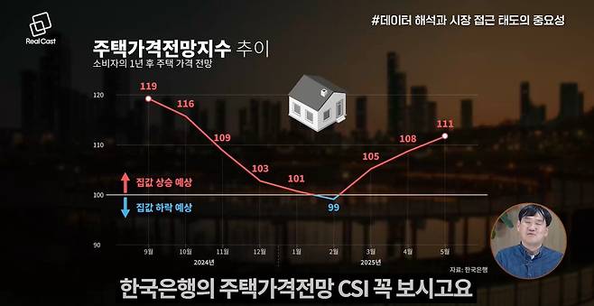 현대는 데이터 르네상스 시대입니다. 누구나 데이터를 볼 수 있지만, 이를 해석하는 능력이 관건입니다. 특히 한국은행의 주택가격전망 CSI, 호갱노노의 상승·하락 거래 비중 등은 시장 흐름을 판단하는 유용한 지표입니다. 남들이 다 하는 것을 피하고, 남들이 안 보는 데이터에 주목할 필요가 있습니다.