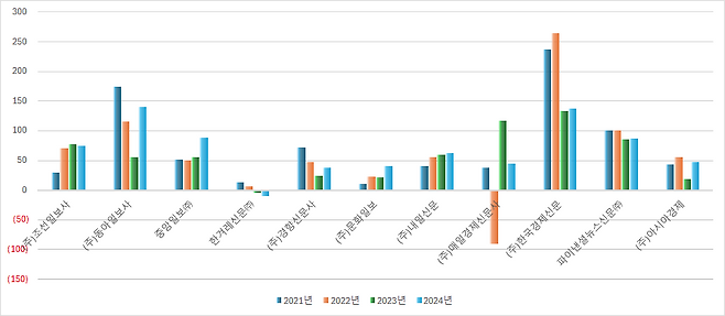 재무제표는 또 다른 진실을 말해준다. 종합지에 비해 경제지가 더 잘 번다. 최근 4년 동안의 주요 언론사 영업이익 추이에서 보듯이 2021~2024년 종합지와 경제지를 비교해 보면 우측의 경제지 이익 추이가 높다. 투자에 대한 전국민의 관심이 높아진 탓인가? 경제 뉴스가 독자들에게 인기를 끌고 있다는 방증이다.