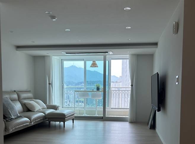 소파 위치를 산뷰를 잘 보일 있도록 지금 보이는 TV 자리에 놓고 싶었지만, TV 선 연결 문제 때문에 아쉽게 저렇게 놓았어요. 그래도 어느 곳이든 산뷰를 감상할 수 있답니다 ♥