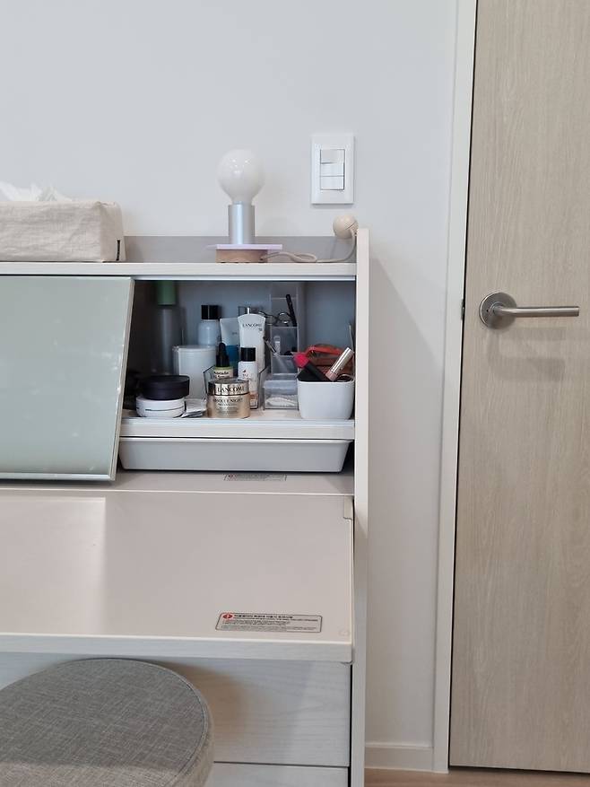 자취할 때 모두 오픈된 화장대를 썼는데 먼지가 쌓이니까 청소하기 귀찮더라고요. 그래서 깔끔하게 잡동사니를 모두 감출 수 있는 화장대를 골랐어요.