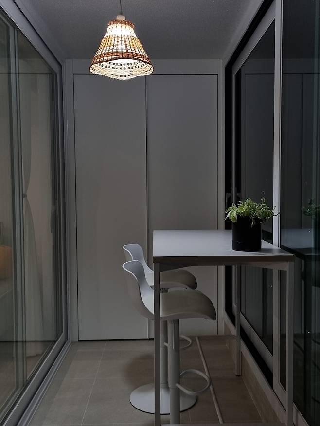 거실 쪽 베란다는 산뷰를 감상하기 위해 홈바 테이블을 놓았어요. 이 홈바 테이블도 그냥 구입한 것이 아니라 창문 난간 높이랑 비슷한 것으로 골라서 시야에 거슬리는 게 없도록 했어요. 그리고 조명도 캠핑 분위기 나도록 라탄 조명으로 포인트를 줬어요.
