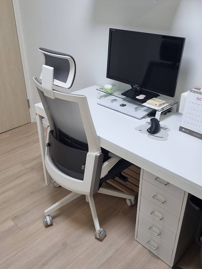책상 밑 가운데에 마켓비 서랍을 넣어 남편과 제 자리를 분리해 주었어요. 서랍 안에는 볼펜, 충전기, 노트 등을 보관하고 있어요.