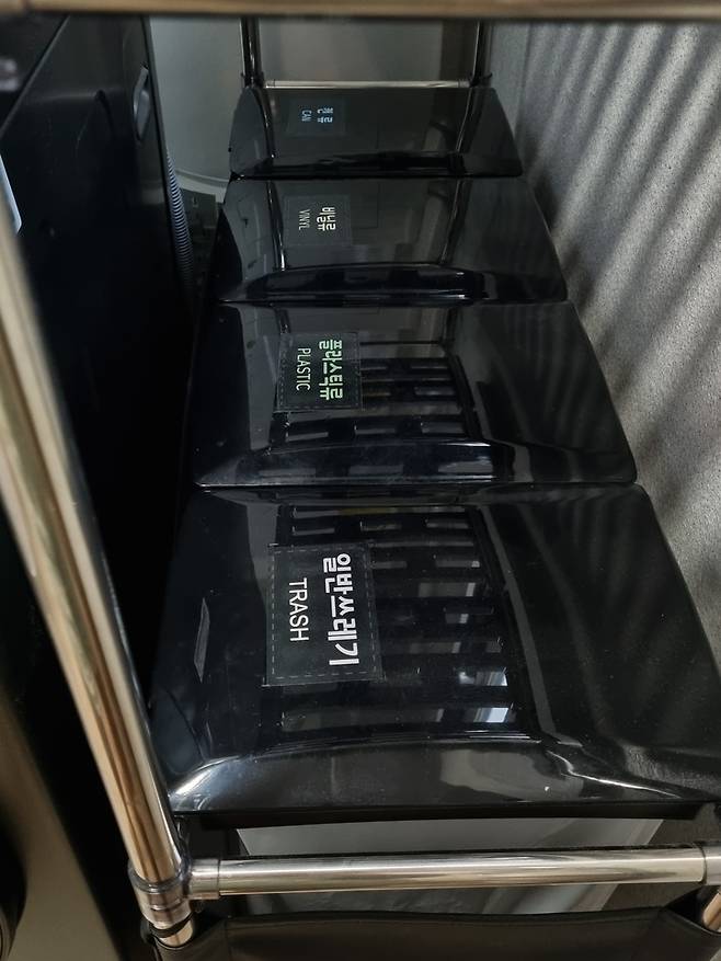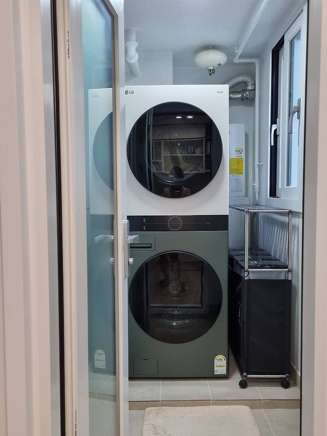 엘지 오브제 워시 타워를 설치할 때 세탁기를 최대한 방 쪽으로 붙여서 옆에 남은 공간을 쓸 수 있도록 했어요. 옆에 빈 공간에는 큰 사이즈의 분리수거 쓰레기통을 놓았어요. 이 분리수거 통도 제가 사이즈를 재서 최대한 큰 것으로 골랐어요.