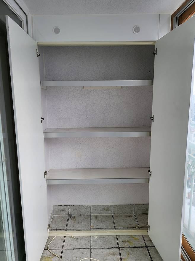 그리고 저는 베란다에서 화분도 키우고 싶었기 때문에 베란다는 확장하지 않고 양쪽에 베란다 팬트리를 만들었어요. 기존에 베란다 팬트리가 있었지만 오래되어서 휘어 있는 상태였어요.