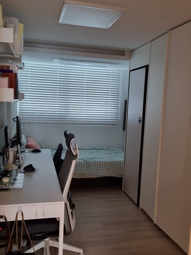 신발장 옆에 있는 방은 취미방입니다. 이 방은 '없는 게 없는 방', '원룸' 방이라고도 불리는 방이에요. 왜냐면 침대, 옷장, 책상, 컴퓨터가 한 방에 다 있는 방이기 때문이에요. 제일 작은 방이지만 제일 알차게 구성한 방이고, 저희 부부 취미 활동하는 방입니다.