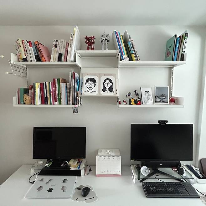 벽 선반을 활용하니 정말 공간을 효율적으로 쓸 수 있는 것 같아 매우 만족하고 있어요. 설치 전에는 답답해 보일까 봐 걱정했는데 전혀 답답해 보이지 않고 오히려 책장이 위에 있으니 책이나 노트를 꺼내 쓰는데 더 편리한 것 같아요.
