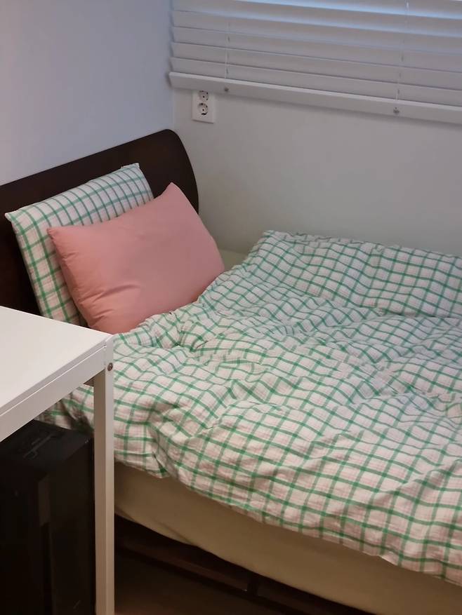 책상 옆에는 싱글 침대가 있어요. 이 침대는 제가 자취할 때 썼던 침대인데 버리기엔 애매했는데 지금은 손님들 올 경우나 부부 중 한 명이 늦게 잘 경우 이 방에서 자고 있어요. 안방 침실과는 다르게 비비드 컬러의 침구로 골랐어요.
