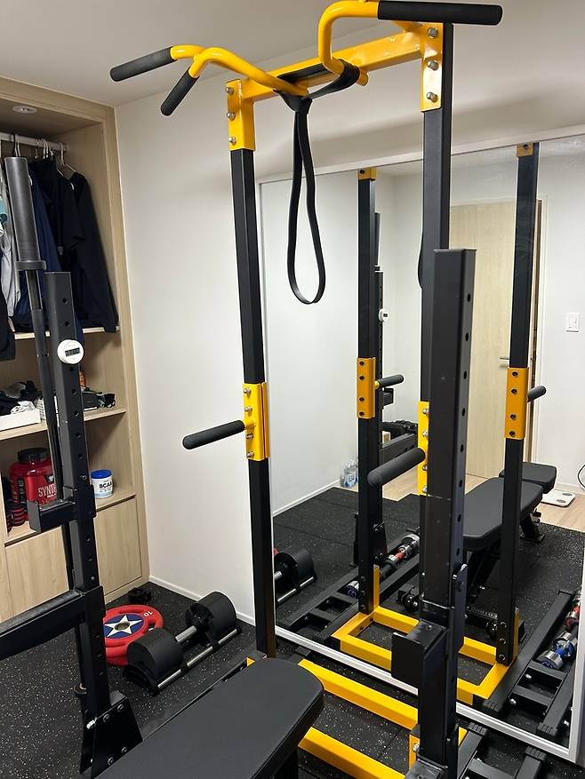 더 크고 좋은 헬스 기구를 놓고 싶었지만, 헬스 장비는 남편이 자취할 때 집에서 사용하던 것 그대로 갖고 왔어요.