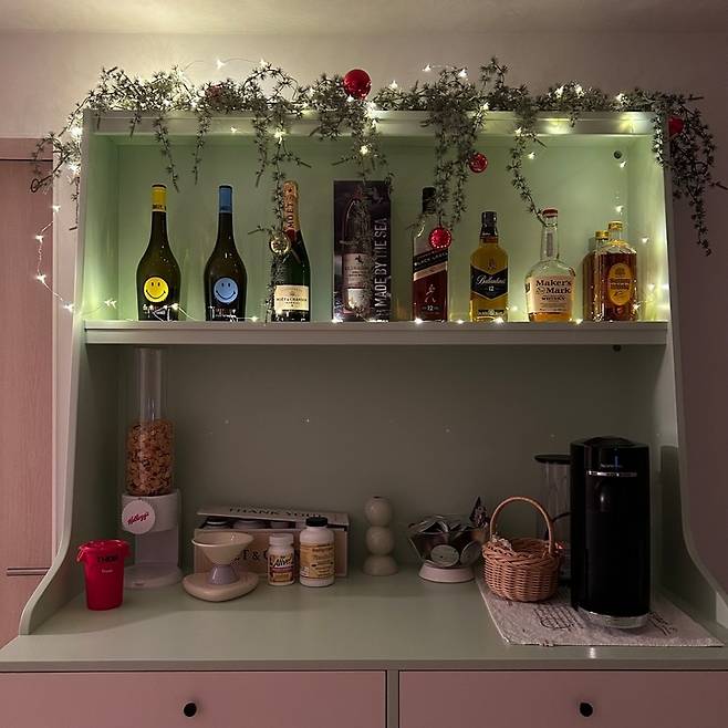 크리스마스 때와 같은 특별한 이벤트에는 카페장을 꾸며주기도 해요. 실제로 보면 하부장이 성인 가슴 아래까지 와서 여기에 서 있으면 스탠딩 파티하는 느낌도 납니다. 저희 키와 맞춰서 제작했더니 오븐 사용할 때나 커피 내릴 때 많이 안 숙여도 되니까 편리해요.
