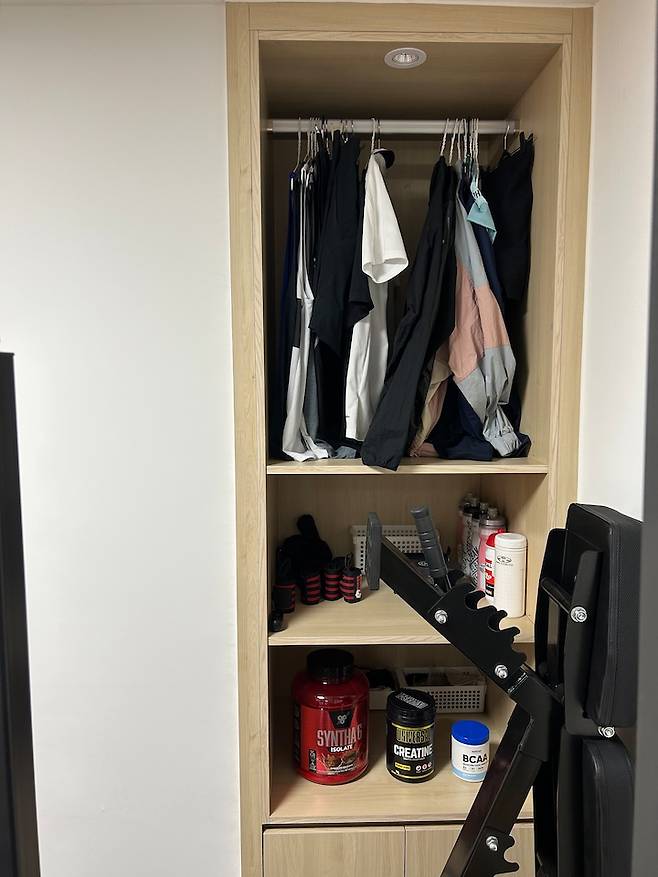붙박이장은 헬스 용품 보관 서랍장으로 변신했어요! 운동복, 영양제, 자전거 용품 등 레저 용품을 보관해두었어요. 저희 부부는 수영, 자전거, 헬스를 좋아해서 장비가 많다 보니 서랍이 꽉 찼는데 이렇게 분리 보관할 수 있어 편리해요. 그러나 이 방을 헬스방으로 말하기엔 모순인 점이 있어요.
