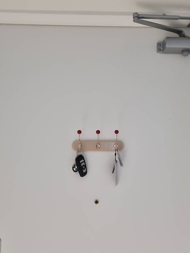 현관문은 최대한 깔끔하게 하고 싶어서 자석 빈티지렉을 부착했고, 자동차 키랑 음식물 쓰레기 키를 보관하고 있어요. 손님들이 볼 때마다 귀엽다고 하는 소품이에요.