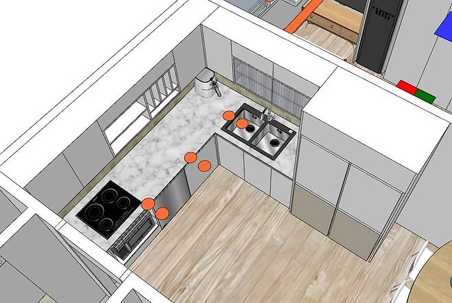 리모델링할 때 내가 필요한 가전이 무엇이고, 어디에 놓고 쓸지 미리 구상을 해 놓아야 필요한 자리에 콘센트를 만들 수 있답니다. (주황색 동그라미는 조명이에요)