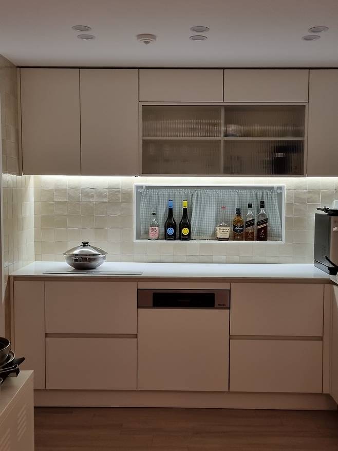 식기세척기도 식세기 컬러만 튀는 게 싫어서 하부장 소재와 맞추려고 식세기 상판 교체가 가능한 밀레 제품으로 골랐습니다. 주방에도 역시 간접조명을 넣어서 조명 하나로 분위기를 변화시킬 수 있었어요. 상부장에는 모루 유리로 수납을 만들었고 자주 사용하는 컵들을 넣어두었어요.