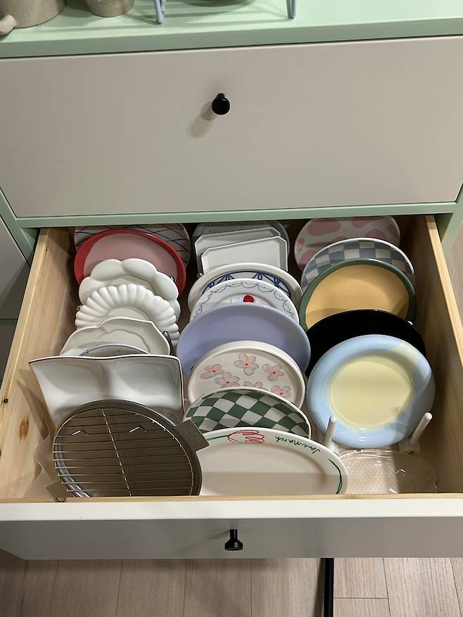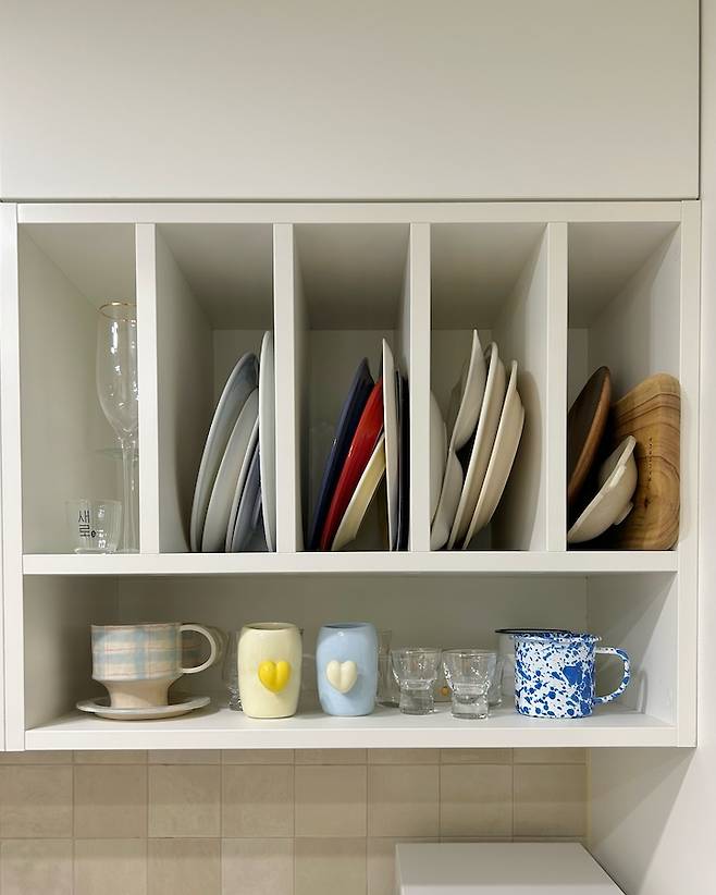 나머지 수납에는 과자를 넣거나 제가 좋아하는 그릇을 꺼내 쓰기 쉽게 정리했어요. 참고로 이 카페장 수납에는 '디저트' 접시들만 들어가 있어요. 나머지 식사 식기류는 식세기 옆 서랍장에 있어요. 사도 사도 끝이 없는 그릇 욕심 ^^