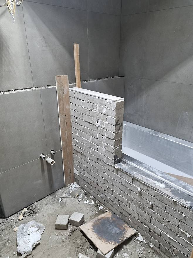 그래서 욕조를 만들고 욕조와 세면대를 분리해 줄 단을 쌓았어요. 조적 욕조는 가격도 비싸고 관리하기 어려울 것 같아 시공하지 않았어요.