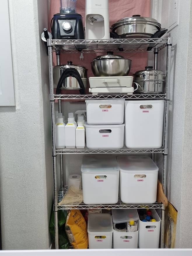 이 철제 수납장은 제가 자취할 때부터 쓴 오래된 가구인데 마치 맞춤 제작인 마냥 이 아파트 사이즈에 딱 맞았어요! 신기하죠? 확실히 주방 팬트리가 있으니 요리할 때 필요한 도구나 재료를 바로 꺼내 쓸 수 있어서 매우 만족하고 있어요.