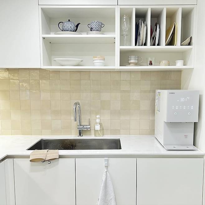 상부장이 모두 막혀있으면 주방이 답답해 보일까 봐 싱크대에 있는 상부장은 오픈장으로 만들었어요.