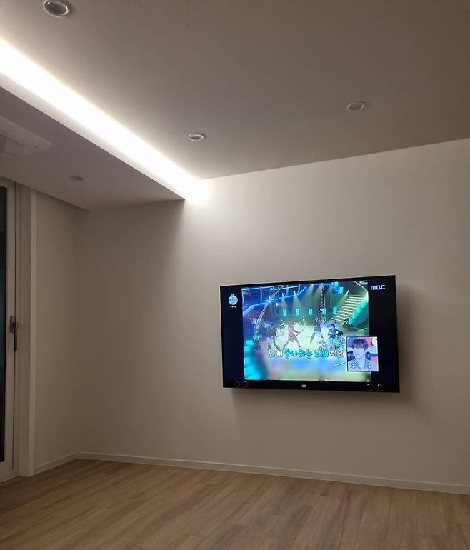 단내림에 있는 간접조명을 켰을 때 모습이에요. 저녁엔 이 불 하나면 켜놓고 영화 보면 분위기가 딱 좋습니다. 최대한 깔끔한 거실을 위해서 TV 장도 안 넣고 벽걸이로 달았어요.