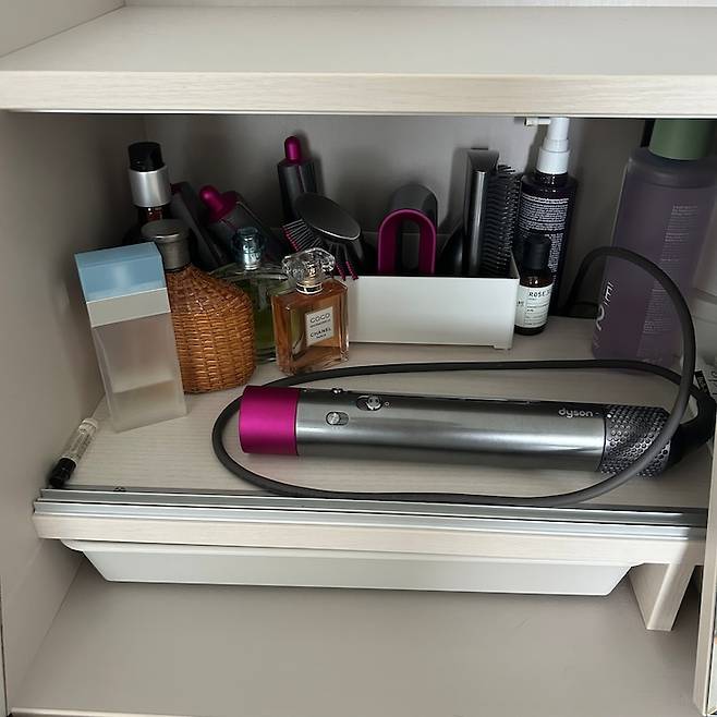 무엇보다 전선 타공이 있어서 미용 기구 전선을 안 보이게 깔끔하게 보관할 수 있어요. 이 화장대는 정말 잘산템 중 하나입니다.