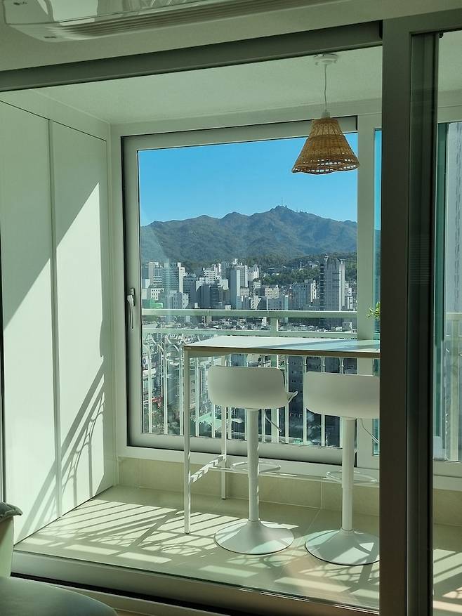거실 베란다에는 원래 캠핑 의자를 놓을까 했지만, 산뷰를 더 좋은 각도에서 감상하려면 높은 테이블과 의자가 필요할 것 같아 스탠딩 테이블로 구입했어요.