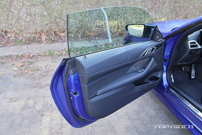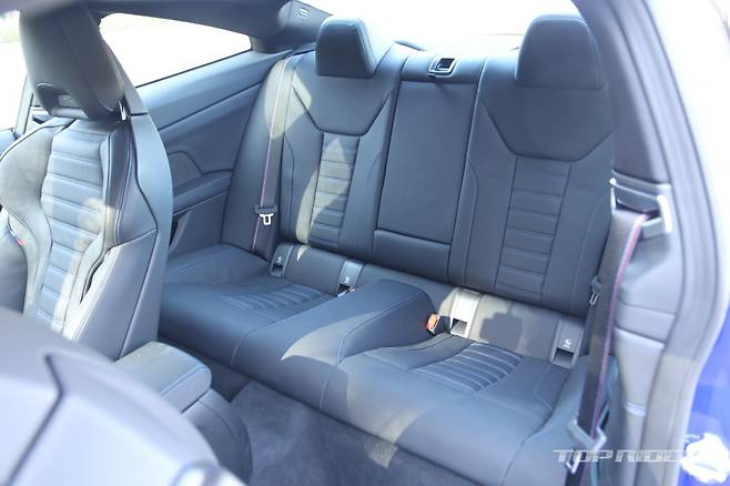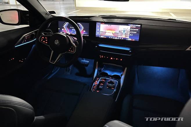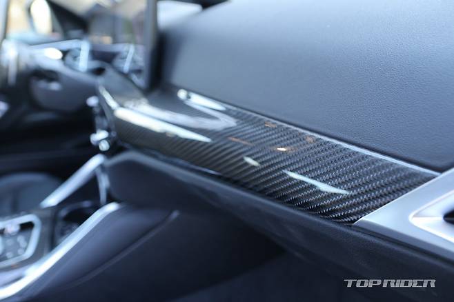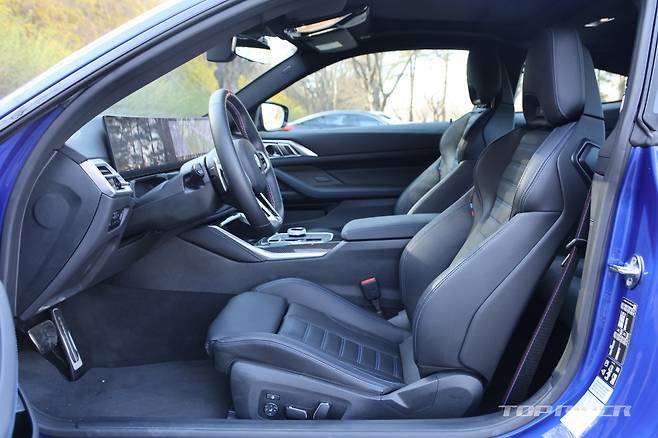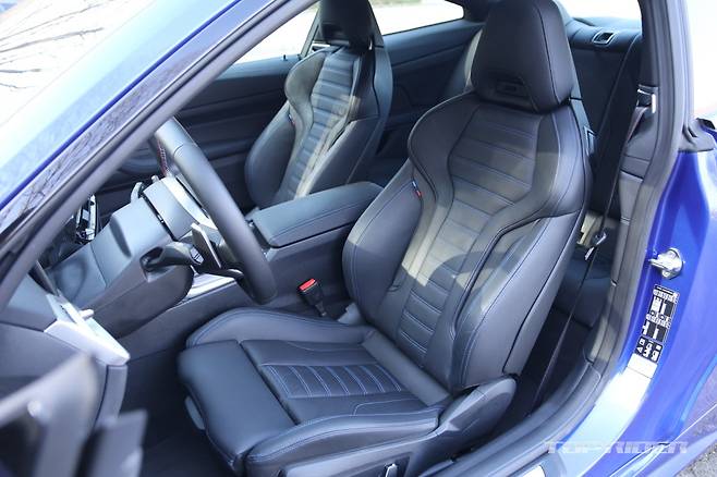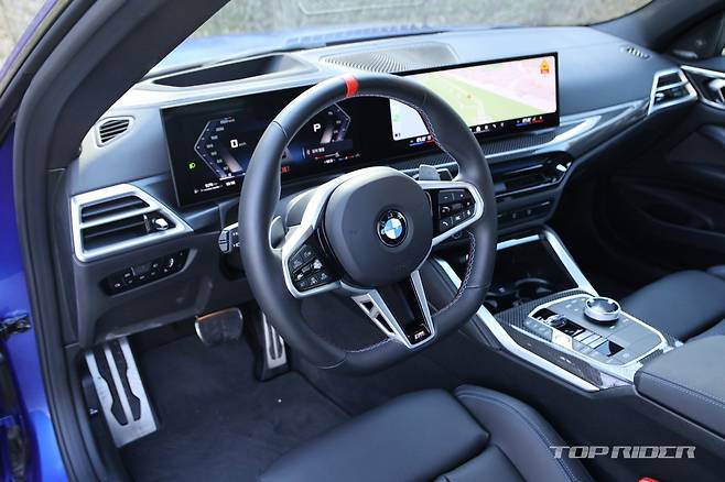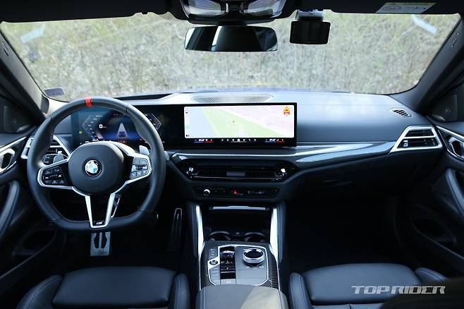 실내에는 12.3인치 디지털 계기판과 14.9인치 디스플레이로 구성된 BMW 커브드 디스플레이, D컷 M 가죽 스티어링 휠, 카본 트림 등이 적용됐다. 최신 현대차 및 제네시스와 다르게 스티어링 휠이 계기판을 가리지 않아 좋다. 시트 포지션은 쿠페 답게 낮다.