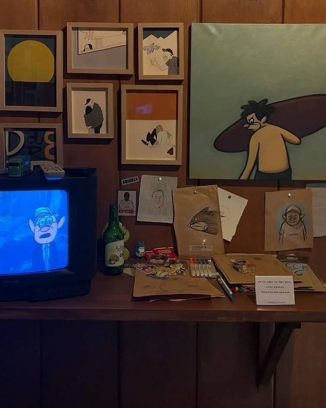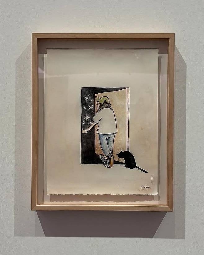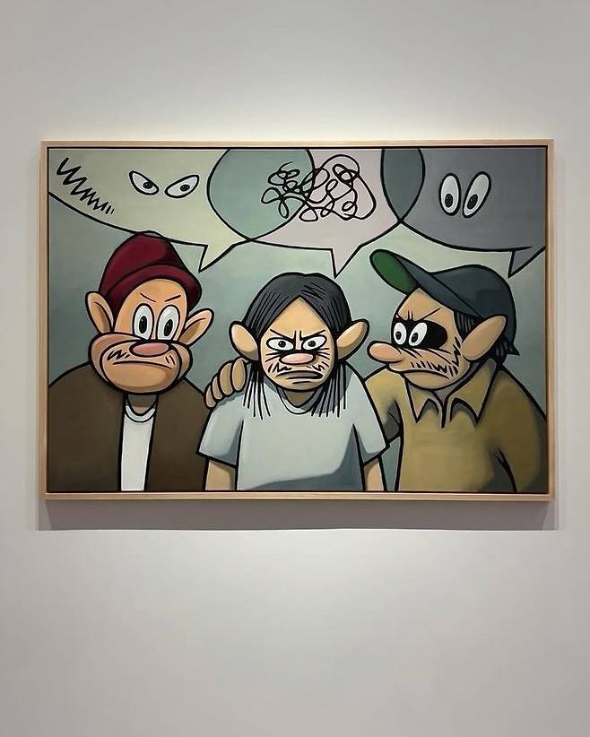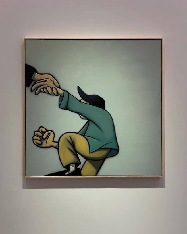 ‘Give a Hand, Take a Hand’ 라는 주제로 선보이는 이번 전시의 대표작으로는 무표정의 세 명의 캐릭터가 그림 밖의 관객을 응시하는 듯한 모습, 창 밖을 바라보는 고양이와 사람 등을 회화로 표현한 ‘무제 시리즈(2024)’가 있다.