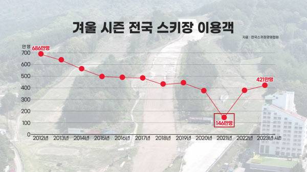 한국스키장경영협회에 따르면, 2011~2012년 겨울 시즌 전국 스키장 이용객은 686만명이었으나, 코로나19를 거치며 146만명까지 급감했다. 이후 일부 회복세가 나타나고 있지만, 업계는 스키 산업의 구조적 침체를 우려하고 있다.