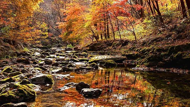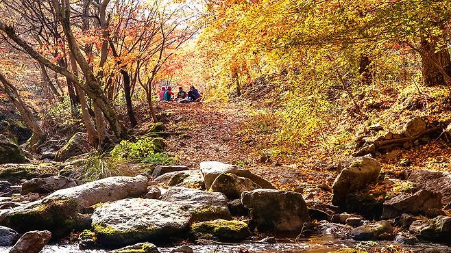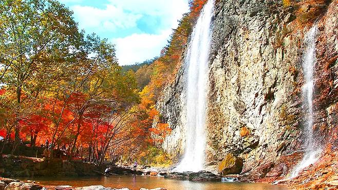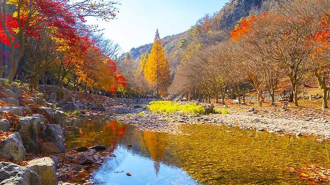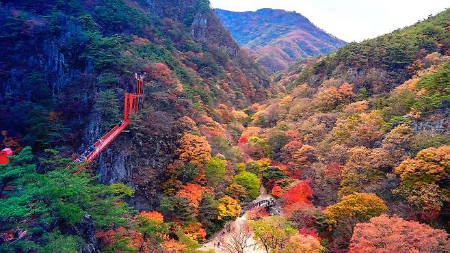 입구에서 구장군폭포까지 이어지는 길은 계절이 그려낸 붉은 카펫이다.