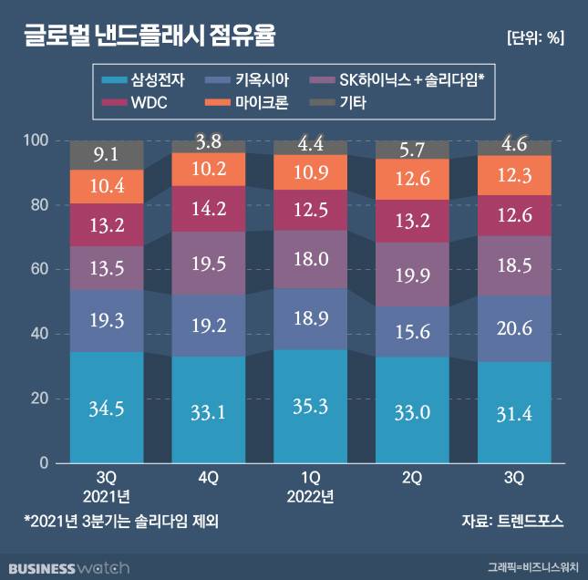 국내 업체들의 시장 점유율도 떨어졌다. 삼성전자는 31.4%의 점유율로 1위를 유지했지만, 올해 들어 시장 점유율이 하락했다. SK하이닉스는 전분기 19.9%에서 1.4%p(포인트) 하락했다.