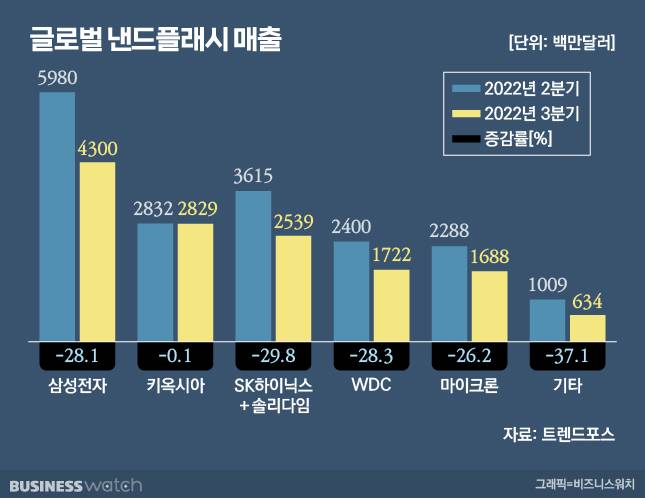 4분기 전망도 밝지 않다. 트렌드포스는 "연말 수요 회복을 기대하기 어렵고 재고는 쌓이고 있어 4분기 낸드플래시 제품 가격은 3분기 대비 20~25% 떨어질 전망"이라며 "낸드플래시 가격이 하락하면서 4분기 매출도 전 분기보다 20% 하락할 것"이라고 분석했다.