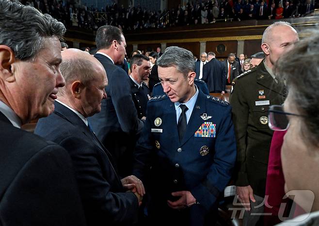 (워싱턴 DC 로이터=뉴스1) 이정환 기자 = 댄 케인 미 합참의장이 24일(현지시간) 도널드 트럼프 미국 대통령의 2기 첫 국정 연설 전 워싱턴 DC 미국 국회의사당 하원 회의장에서 크리스 쿤스 상원의원(민주·델라웨어)과 인사를 나누고 있다. 2026.02.24.