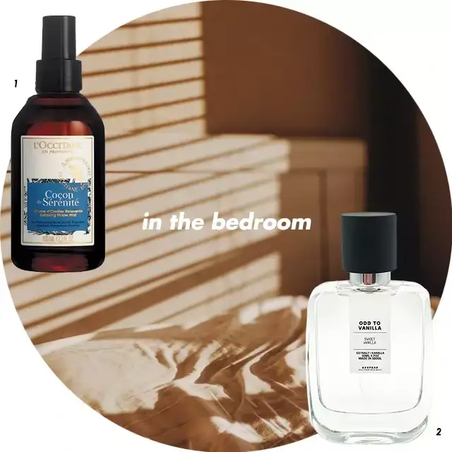 침실에는 따뜻한 분위기를 만들어줄 수 있는 묵직한 향이나 스트레스 완화 효과가 있는 아로마 계열을 추천. 패브릭과 공간에 함께 스프레이 할 수 있는 멀티 홈 퍼퓸을 추천하는데 바닐라, 우드, 스파이시한 향조를 선택하면 포근한 분위기를 연출하기 좋다. 여러가지 향을 첨가한 제품보다 단순하게 한두가지 향으로 구성된 제품이 베스트. 침구에 사용하는 제품은 피부에 직접 닿고 자는 동안 심신에 영향을 주기 때문에 편안한 아로마 계열의 향이 적격이다. 라벤더, 오렌지, 베르가못 등 릴랙싱과 숙면에 도움을 주는 향을 선택해보자.