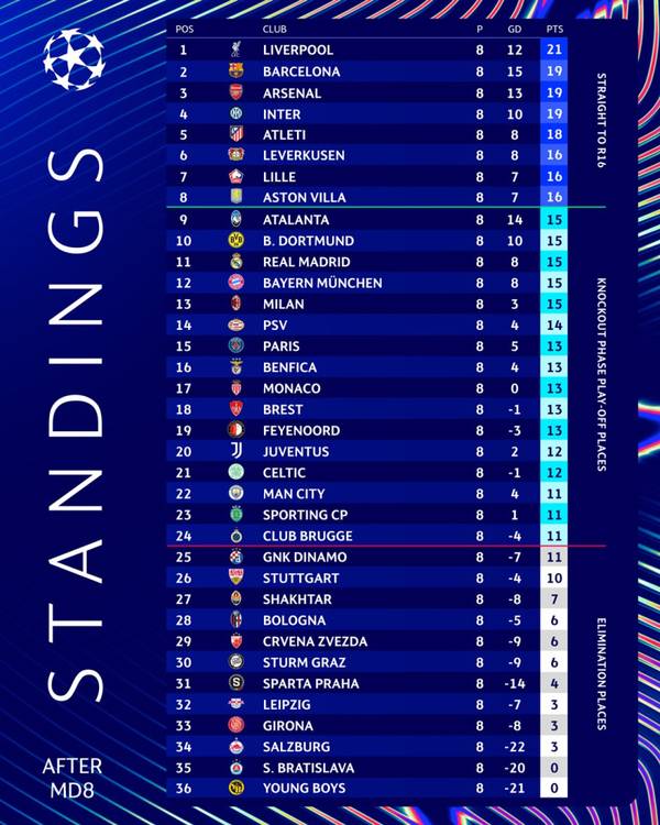 확정된 순위에 따르면 리버풀(잉글랜드)·바르셀로나(스페인)·아스널(잉글랜드)·인터밀란(이탈리아)·아틀레티코 마드리드(스페인)·레버쿠젠(독일)·LOSC 릴(프랑스)·애스턴 빌라(잉글랜드)가 1~8위로 16강 직행에 성공했다.