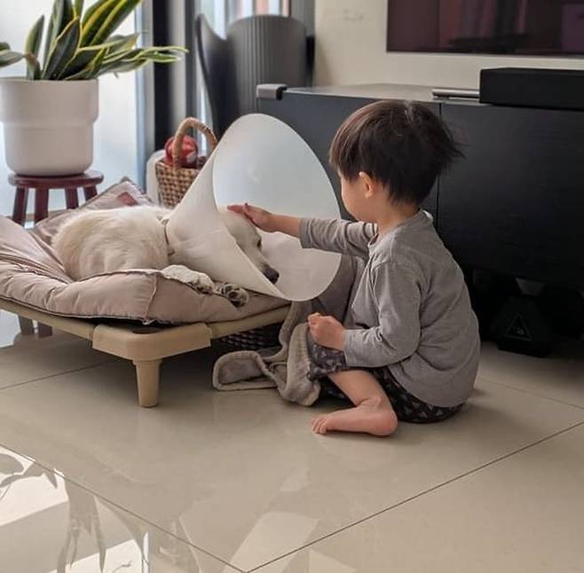 그런데 여기 넥카라를 쓰고 기운이 쏙 빠진 강아지 형아를 위해 아주 특별한 위로를 건넨 2살 꼬마 집사가 있어 잔잔한 감동을 주고 있습니다.