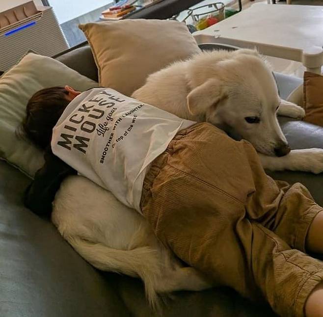 가족들은 이 따뜻한 장면을 카메라에 담으며 큰 감동을 느꼈습니다. 아이가 태어났을 때 혹시나 쿠모가 소외감을 느끼지 않을까 걱정해 하루 세 번 산책을 꼬박꼬박 챙기며 노력을 기울였던 부모님의 정성이 빛을 발하는 순간이었죠.
