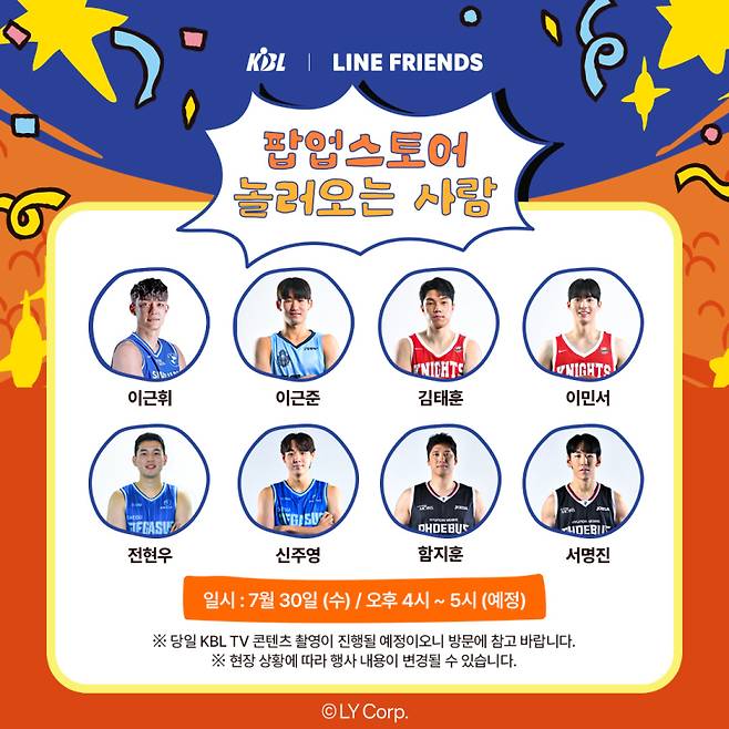 다양한 이벤트도 진행한다. 30일 오후 4시부터 5시까지 이근휘(삼성), 이민서, 김태훈(SK), 함지훈, 서명진(현대모비스), 이근준(소노), 전현우, 신주영(한국가스공사)이 참석해 일일 아르바이트에 나선다. 이 외에도 팝업스토어 기간 동안 럭키드로우를 진행하여 KBL 프렌즈 굿즈를 경품으로 증정할 예정이다.