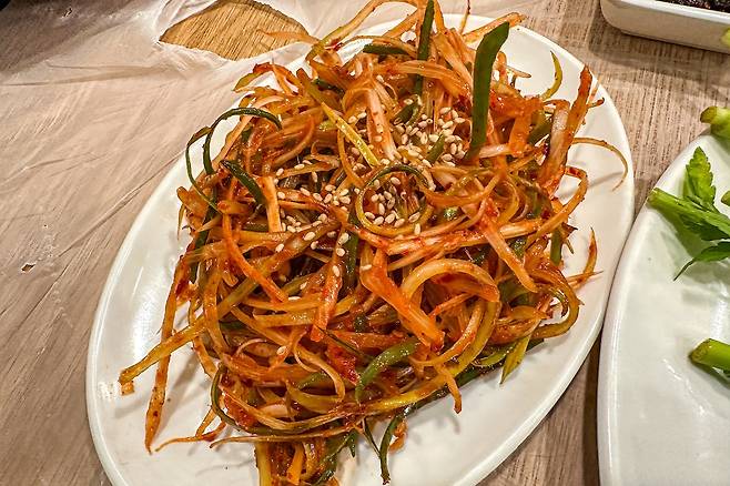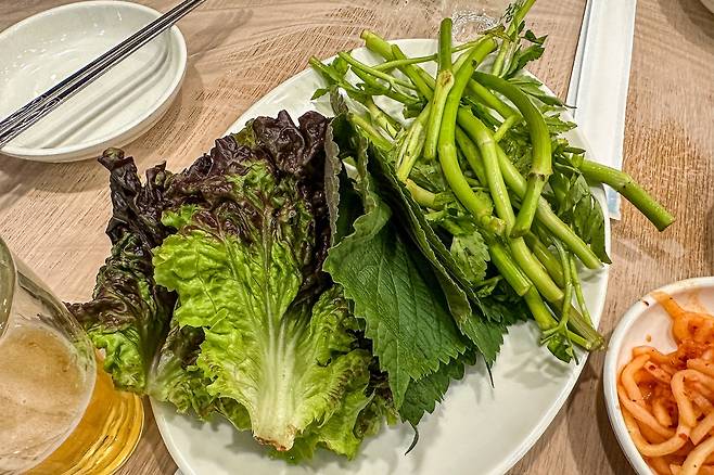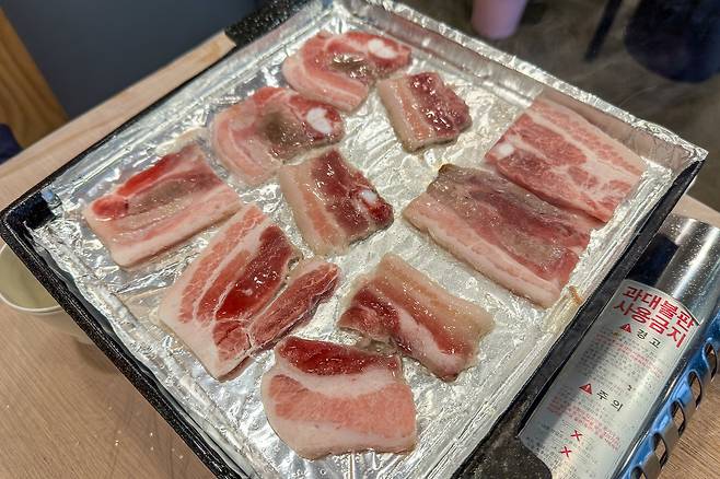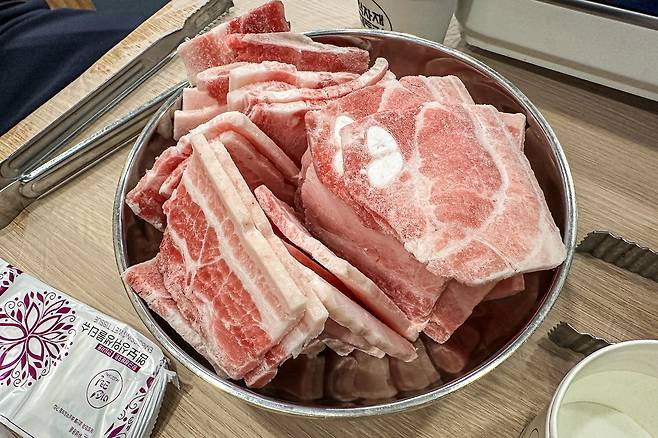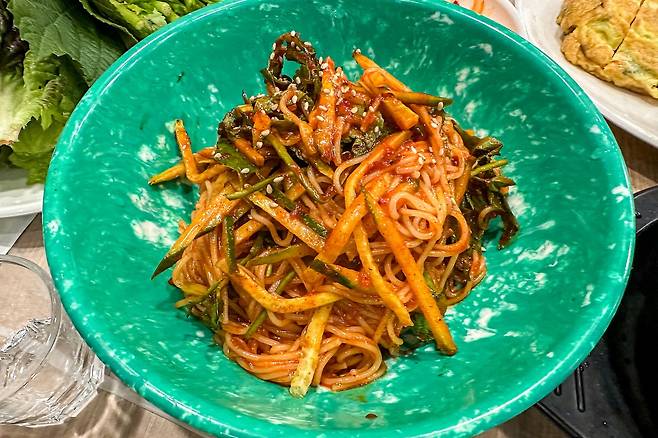 이곳의 특징은 국내산 냉동 삼겹살을 취급하는 데 1인분에 12,000원을 받는다. 나쁘지 않다. 요즘 같은 주머니 사정이 빠듯한 시절에 이 정도 가격의 냉삼이라면 흡족한 편. 그런데 삼겹살은 기본이고 청국장찌개와 김치찌개 또 비빔국수와 계란말이까지 가격도 모두 착하고, 맛은 두말하면 잔소리다. 정말 진득하니 맛있다. 개인적으로는 냉삼에는 가장 중요한 것이 파무침이라고 생각하는데 여기 파무침이 정말 취향 저격이었다.