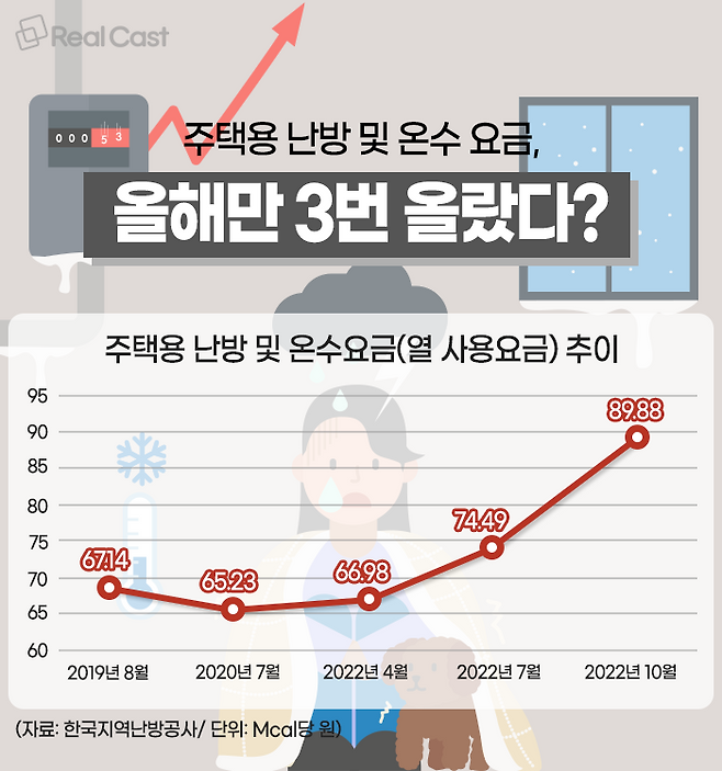 겨울을 앞두고 난방, 온수, 난방연료인 등유 값이 모두 대폭 올랐습니다. 지난 11월 7일 한국지역난방공사에 따르면, 올해 1Mcal(메가칼로리)당 주택용 열 사용요금은 4월 66.98원에서 7월 74.49원, 10월 89.88원으로 3개월 간격으로 세 차례 올랐습니다. 열 요금이 오른 것은 2019년 8월 이후 3년 만으로, 한 해 세 차례 인상된 건 처음입니다.