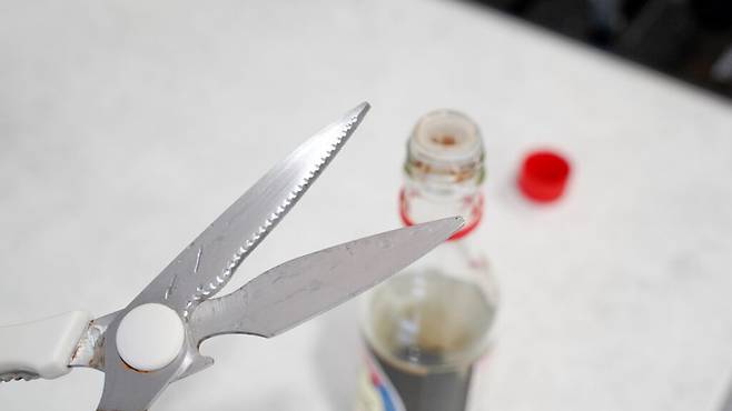 유리병의 입구에 가위를 깊숙이 넣어주세요. 한쪽 방향으로만 조심스럽게 가위질을 합니다. 1분 정도 반복하면 날카로워진 가위날을 확인할 수 있어요!