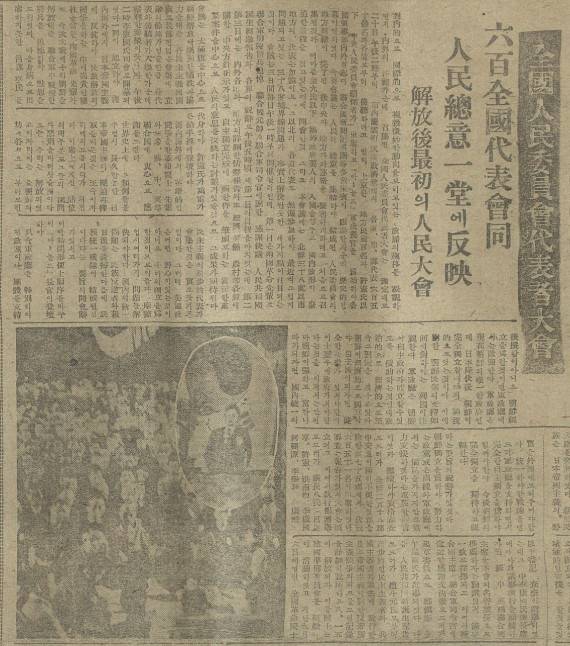 | ▲ 전국인민위원회 대표자대회 회의 전국인민위원회 대표자대회 기사. 중앙신문 1945.11.21 |