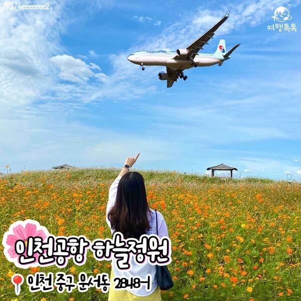 가을이면 넓은 대지에 종류별 코스모스가 만개하는 인천공항 하늘정원입니다. 인천공항 옆에 위치해있어 비행기가 이륙하고 착륙하는 모습을 가까이에서 볼 수 있어 머리 위로 비행기가 지나가는 이색적인 사진을 남길수도 있는 곳으로 유명한데요.