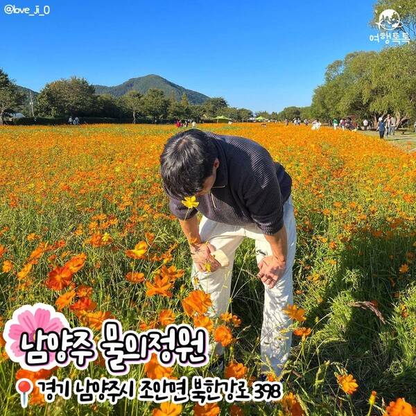 서울에서 가까우며 강변을 따라 산책하기에도 좋은 남양주 물의 정원입니다. 북한강과 운길산을 배경으로 넓게 펼쳐진 코스모스 꽃밭이 있어 가을 명소이기도 합니다. 노란빛과 주황빛의 코스모스가 주를 이뤄 알록달록한 색감을 연출합니다.