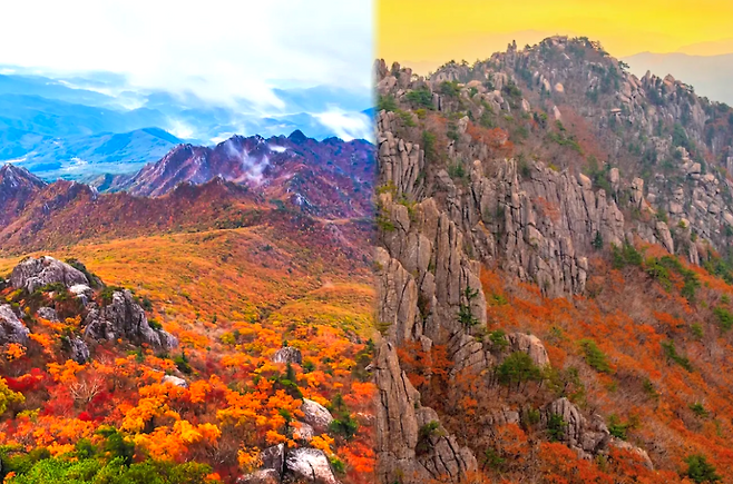 설악산은 우리나라에서 가장 먼저 단풍이 드는 산이다. 9월 말부터 정상에서부터 물들기 시작해 10월 중순이면 천불동 계곡을 중심으로 붉은 단풍 물결이 산을 가득 메운다. 가을이 시작되는 시점에 단풍을 가장 먼저 만나보고 싶다면 설악산이 제격이다.