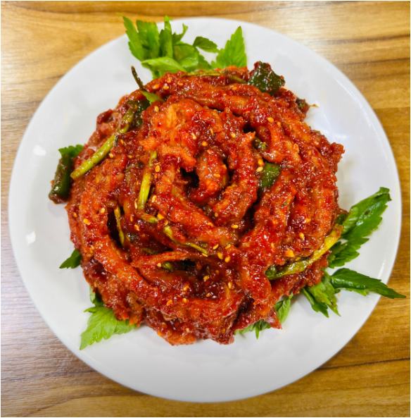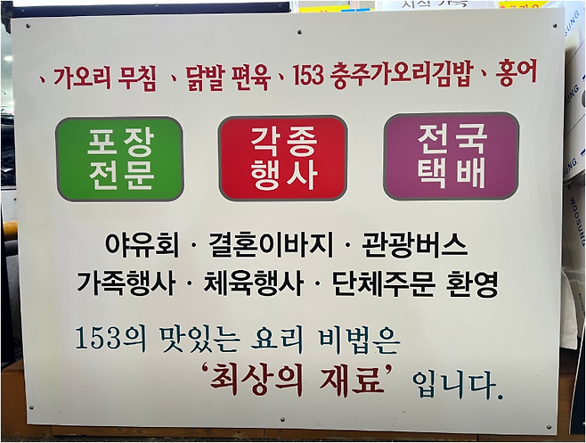 닭발편육은 말 그대로 닭발을 오래 삶아 뼈를 제거한 후, 압착해서 만든 편육이에요. 흔히 닭발하면 맵고 양념된 것만 생각하지만, 이건 담백하면서도 쫀득한 식감이 매력이에요. 그냥 먹어도 좋지만, 매운 양념장에 살짝 찍어 먹으면 감칠맛이 확 살아나고요. 샐러드에 얹거나 비빔밥 토핑으로도 활용도 좋아요. 냉장 보관된 상태에서 살짝 데우면 더 부드럽고 따뜻하게 즐길 수 있어요. 153 가오리와 충주김밥에서 판매하며, 충주무학천변길에 위치해 있어요.