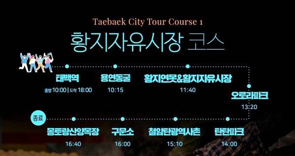먼저 정기 코스는 오전 10시 태백역을 출발해 몽토랑산양목장 또는 꿈벌사슴목장∼용연동굴∼황지연못·황지자유시장∼철암역사촌∼구문소·자연사박물관을 거쳐 오후 6시 태백역으로 돌아옵니다.