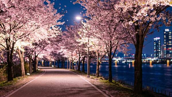 여의도 벚꽃의 진짜 매력은 해가 진 뒤에 시작됩니다. 밤마다 벚꽃 나무를 따라 설치된 파스텔톤 LED 조명이 일제히 점등되어 낮과는 전혀 다른 환상적인 분위기를 연출합니다. 조명은 보통 일몰 직후부터 밤 10시까지 운영되어 직장인들의 야간 산책 코스로도 인기입니다.
